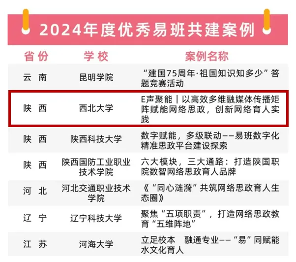 近日,教育部易班发展中心公布了2024年度全国易班共建优秀名单,由我院辅导员蔡一璇申报的案例《E声聚能|以高效多维融媒体传播矩阵赋能网络思政,创新网络育人实践》获评“2024年度全国优秀易班共建案例”;我院辅导员周宛瑾获“2024年度全国优秀易班辅导员”称号;我院辅导员韩钰获评“2024年度全国优秀易班指导教师”。