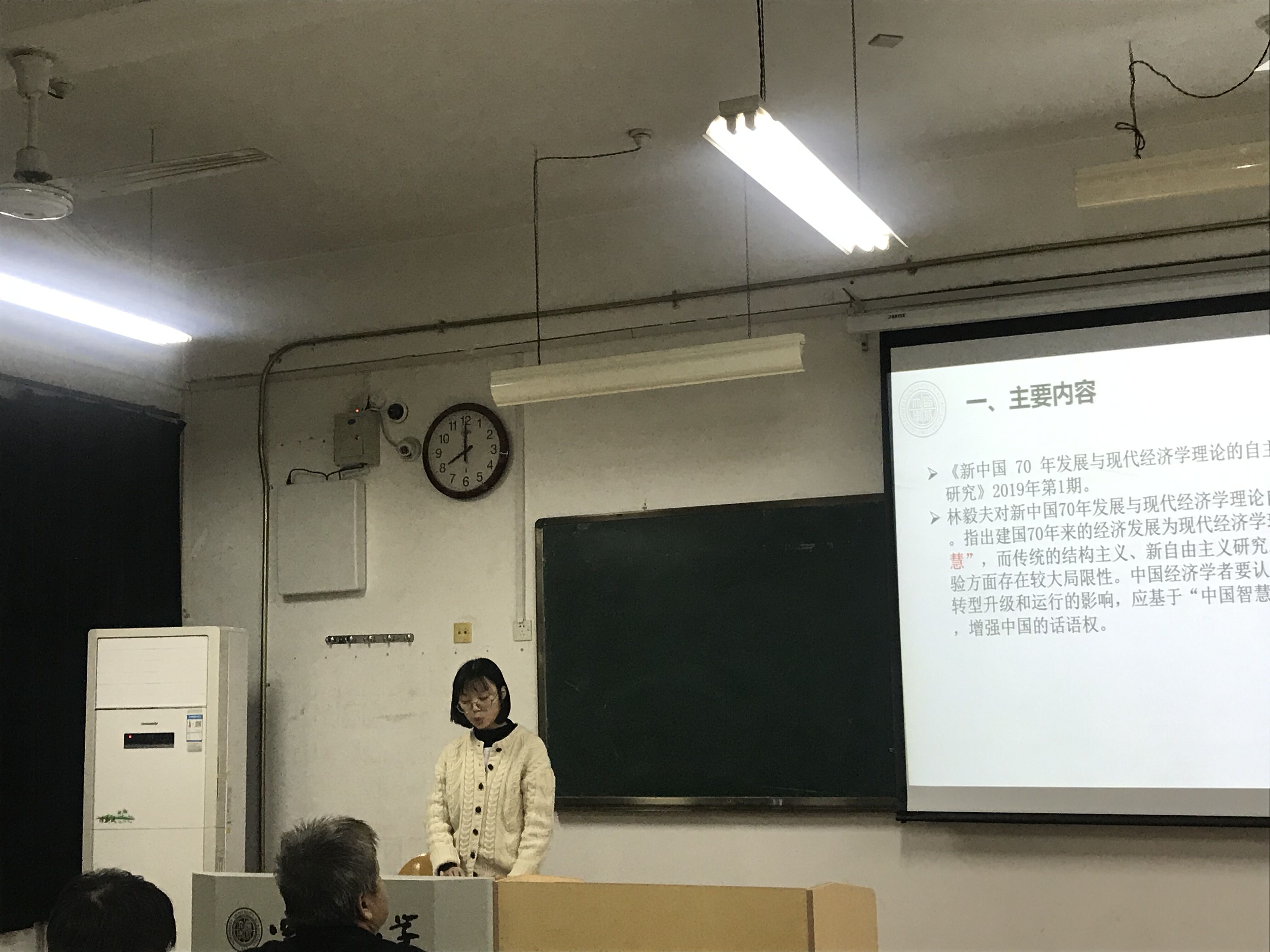 基地学术课堂的第二单元为文献研习,2017级经济学基地班本科生史亚萍讲解了《宏观质量研究》2019年第1期文章《新中国70年发展与现代经济学理论的自主创新》,由2018级经济学基地班本科生黄景彦对该篇文章进行了评论。