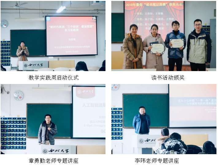 1月15日,首先由马莉莉老师介绍本次实践活动基本构想;而后王颂吉老师主持国贸系读书活动颁奖仪式,并布置寒假读书工作。随后第一场专题讲座是由西北大学信息科学与技术学院的章勇勤老师主讲“人工智能进展及其应用背景”,内容包括当前人工智能的发展现状、应用领域及未来的发展趋势。下午第二场专题讲座由西北大学中东研究所李玮老师主讲“泛安全化时期的国际关系和中国新青年面临的机遇和挑战”,内容包括“世界与梦想”、“2018年来‘一带一路’建设的重点和难点”,以及新时代下的新青年所面临的机遇和挑战。通过李老师生动有趣的讲解,同学们对当前的全球形势、特别是中美关系有了进一步的认识。晚上第三场专题讲座由华夏幸福基业的靳毅先生主讲“开发区和园区经济模式分析”,他首先介绍了开发区的类型、牌子赋能,其次介绍了企业的规模与类型、公共技术平台、陕西航空综合保税区,最后介绍了华夏幸福集团的运营模式。聆听完讲座,同学们认识到,陕西作为一个拥有众多科技园区的省份,需要充分挖掘优势,应对挑战,并且和“一带一路”相结合,以促进地方经济发展。
