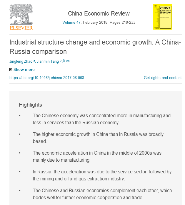 近日,我院世界经济与贸易系赵景峰教授和加拿大工业部高级研究员Jianmin Tang先生的合著论文“Industrial Structure Change and Economic Growth: A China-Russia Comparison”发表在研究中国问题的知名SSCI检索期刊《China Economic Review》,Volume 47, February 2018, Pages 219-233,China Economic Review近五年综合影响因子为2.008。