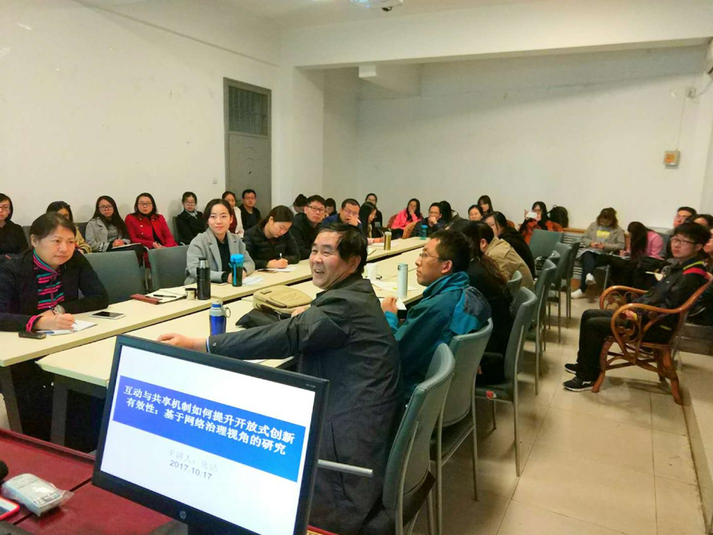 张洁博士向大家分享了国家自然科学基金青年项目“互动与共享如何提升开放式创新创新有效性:基于网络治理视角的研究”的研究思路与研究计划,介绍了目前的开展情况。围绕“企业如何设计与组合开放式创新多重关系网络?”,以及“企业如何通过构建网络组织间共同创造价值的互动机制,以及组织间进行价值分配的共享机制提升开放式创新网络价值?”两个关键问题进行论述,提出了为解决这两个问题拟开展的研究工作。张洁博士就如何更好的开展研究工作,听取了各位老师的意见和建议。相关老师和同学提出了各自的问题与看法,互相分享学术观点,共同探讨了相关学术研究问题。