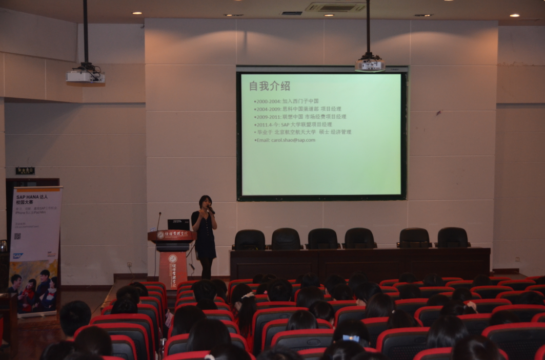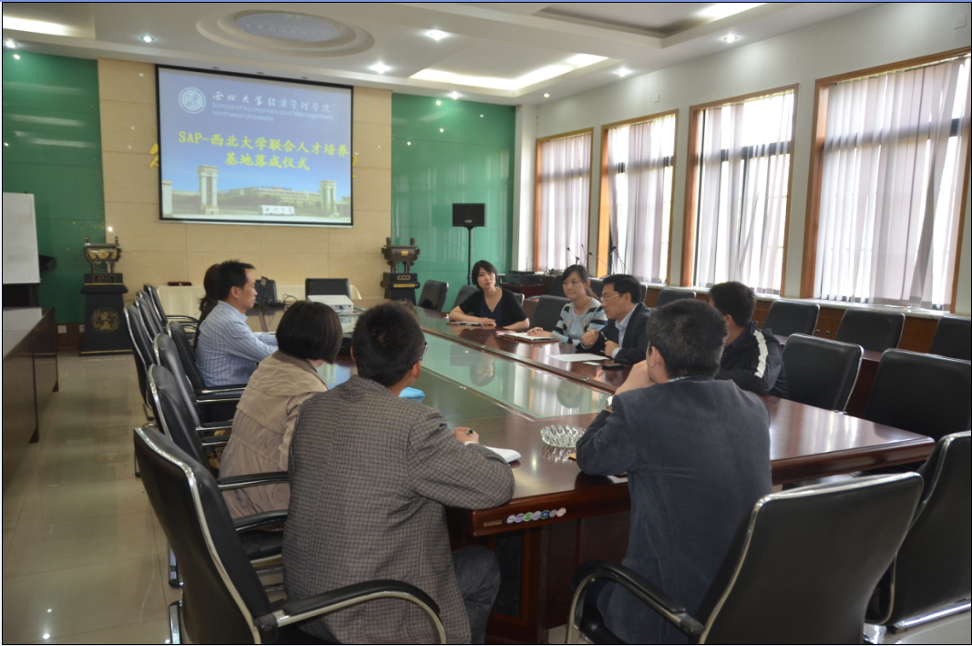 4月26日,我院与全球最大的企业信息管理和协同化商务解决方案供应商——德国SAP公司签署了联合人才合作培养协议,SAP-西北大学联合人才培养基地正式挂牌。SAP公司大学联盟部西北区总经理Charo Shao,副院长杜勇、院党委副书记李一凡和学院管理类专业、教学实验中心等相关教师参加了基地揭牌仪式,并就相关课程开发进行了研讨。当天晚上,Charo Shao还为管理学相关专业学生作了讲座,对SAP公司开发的企业管理软件进行了介绍,并结合实例作了讲解。