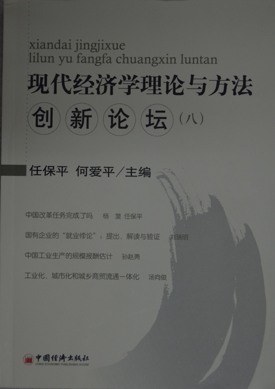 2012年6月,《现代经济学理论与方法创新论坛》第八辑由中国经济出版社正式出版。《现代经济理论与方法创新论坛(八)》是以我院经济学系、西北大学国家经济学基础人才培养基地主办的“现代经济学理论与方法创新论坛”讲稿为主体的一本论文集,由任保平教授、何爱平教授担任主编。