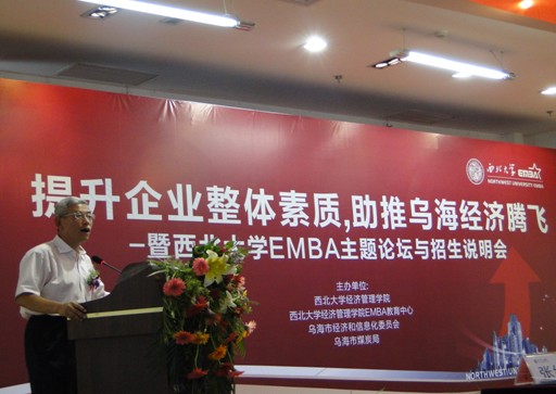 2010年7月4日,西北大学EMBA主题论坛暨招生说明会在乌海市阳光万豪酒店12楼多功能会议室隆重举行,本次论坛以“提升企业整体素质,助推乌海经济腾飞”为主题,乌海市委常委、常务副市长冯玉臻,市人大常委会副主任武文俊,市政协副主席吕继俄出席论坛,乌海市经信委主任宋晓春、煤炭局局长孔庆文以及相关部门和企业的代表近200多人参加了论坛。