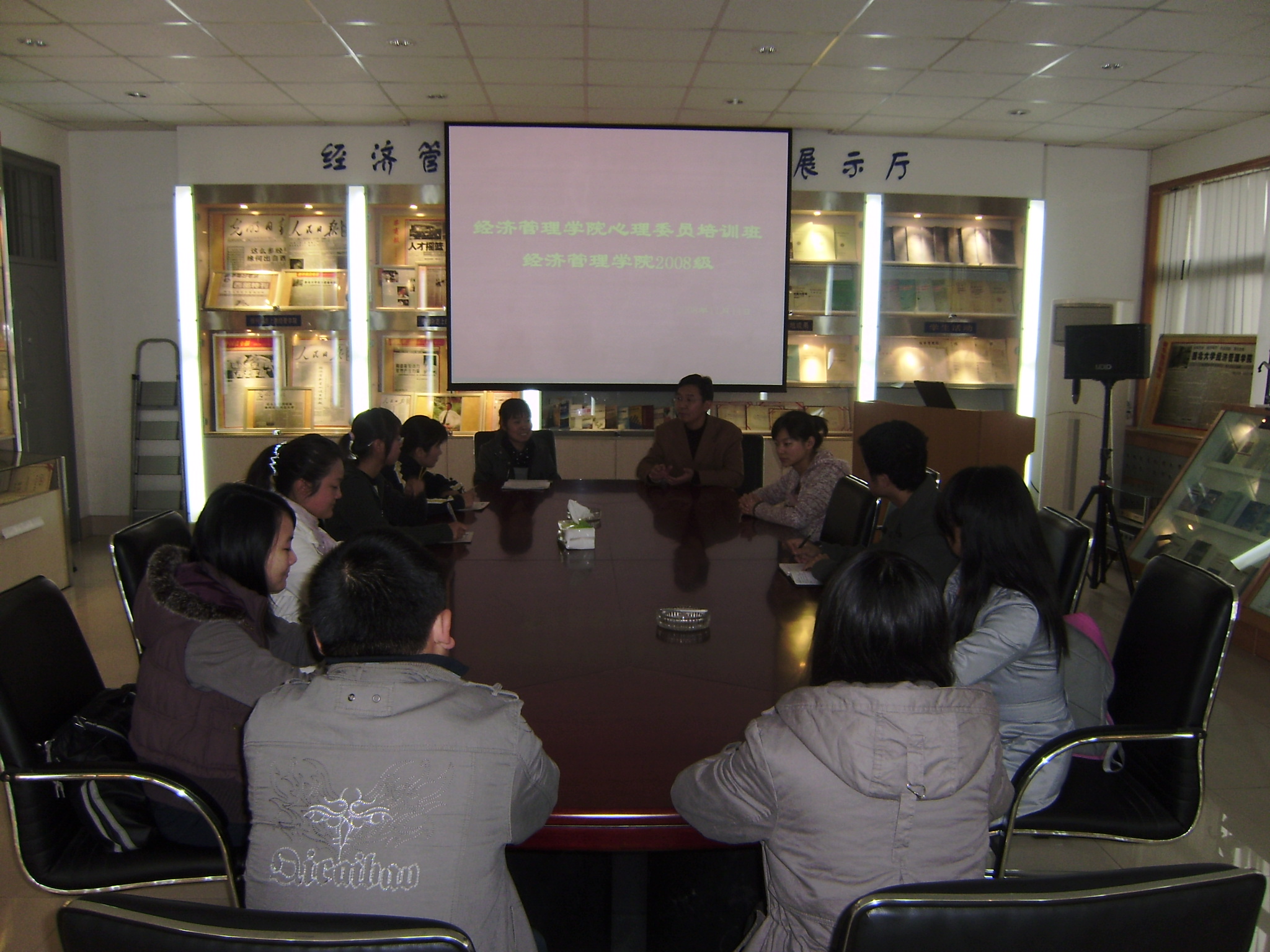 2008年11月14日下午,我院首届心理委员培训班在学院展室举办。学校心理咨询中心同雪莉老师应邀作专题辅导。开班仪式由团委副书记张冉冉老师主持。院党总支副书记樊涛老师出席开班仪式。