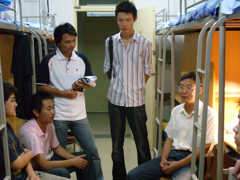 几位领导、老师不顾连日来迎新工作的辛苦和疲惫,对08级新生男女生宿舍挨个进行了走访。走访过程中,新生宿舍整洁的内务得到了领导、老师的赞赏,他们强调让同学们将这种好习惯保持下去,使自己的大学生活在有序条理中走向辉煌。另外,薛来前书记还特别强调了宿舍就是一个小的家庭,宿舍成员之间要融洽相处,互帮互助,学会宽容,学会理解,努力营造家的温馨,让每一个成员都能感受到宿舍内家一般的温暖。几位领导老师仔细地询问了同学们生活中各个方面的问题,希望同学们尽快完成从中学生到大学生的转变,尽快地适应学校生活,以积极的心态全身心地投入到全新的大学生活中去。同时领导及老师们询问了学生们对西北大学的印象,以及对他们之后即将开始的军训、学习生活给予了指导,也寄予了很大的希望。