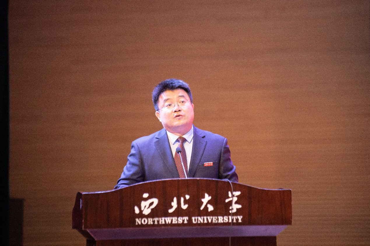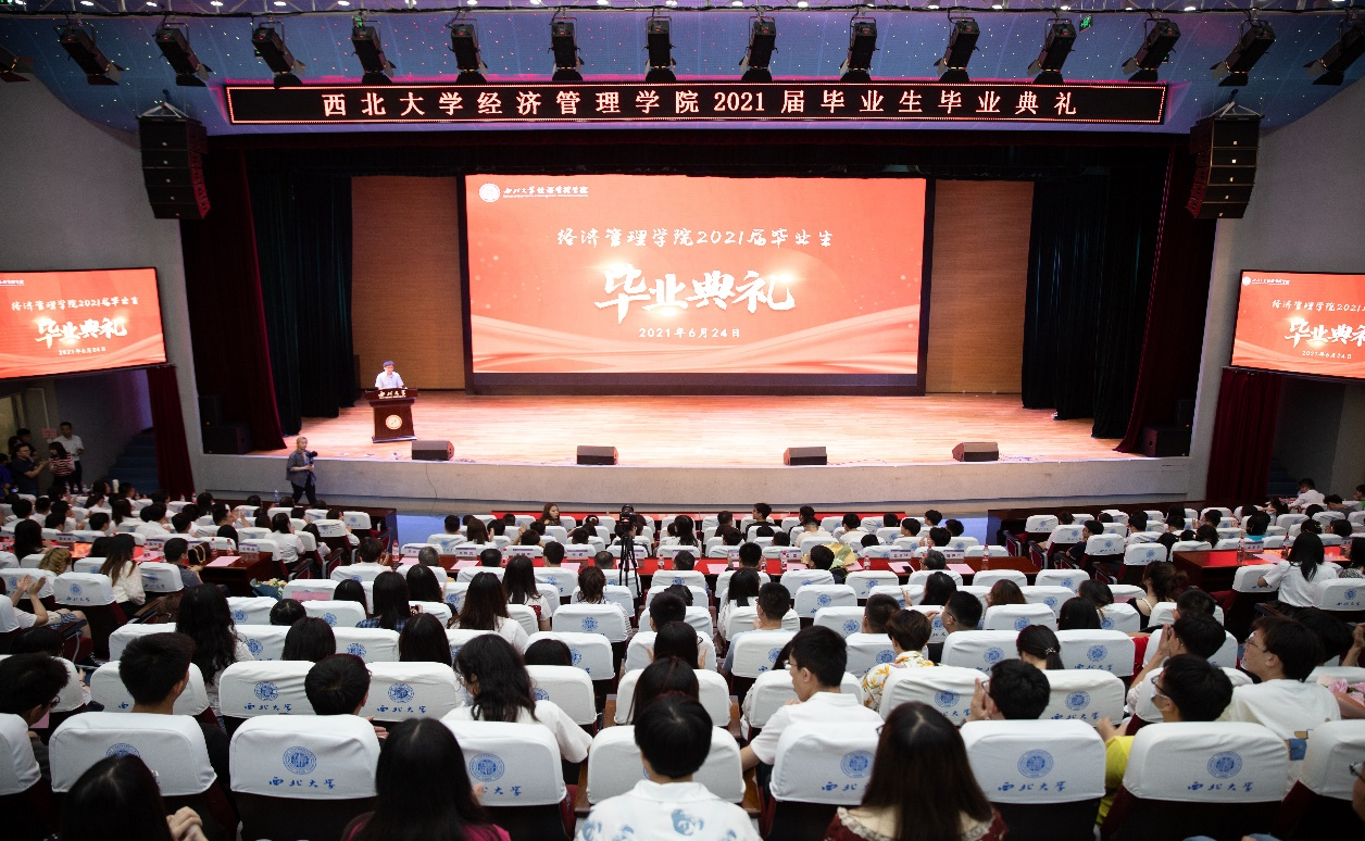 2021年6月24日,776net必赢官网2021届学生毕业典礼在西北大学长安校区大学生活动中心报告厅隆重举行。招商银行西安分行零售金融事业部总经理兼零售信贷部总经理、我院2006届院友但昭,西北大学副校长、776net必赢官网院长吴振磊教授,党委书记杜勇与学院党政领导班子成员,各系主任、中心负责人,教师代表及2021届全体毕业生共同参加了本次典礼,典礼由学院党委副书记徐自成主持。