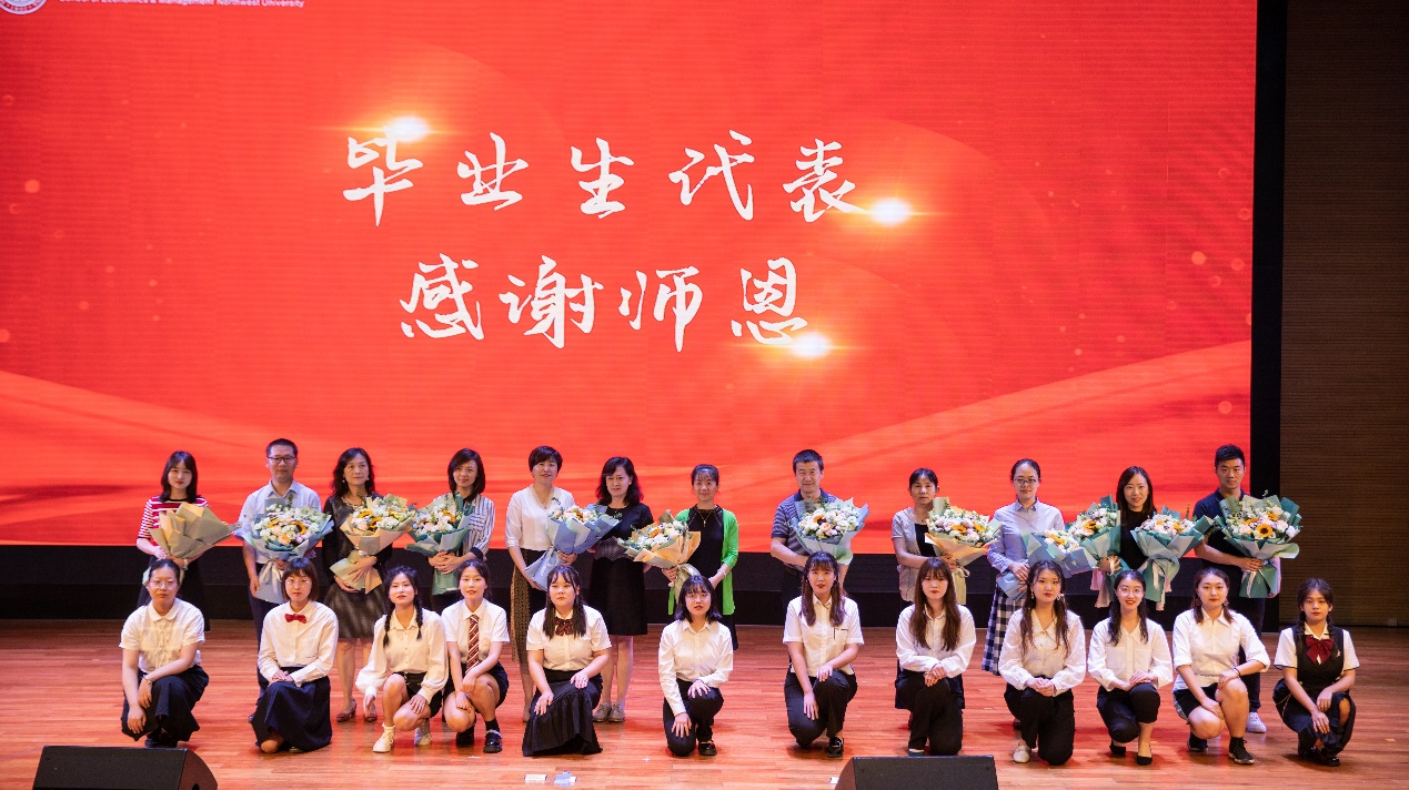 在毕业生即将离别母校,踏上人生新征程之际,向学院教师代表献花,感谢老师的辛勤培育和谆谆教诲。