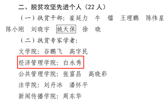7月16日,学校颁布了《中共西北大学委员会 西北大学 关于表彰西北大学脱贫攻坚先进集体和先进个人的决定》,我院荣获“西北大学脱贫攻坚先进集体”称号、我院白永秀教授荣获“西北大学脱贫攻坚先进个人”称号。