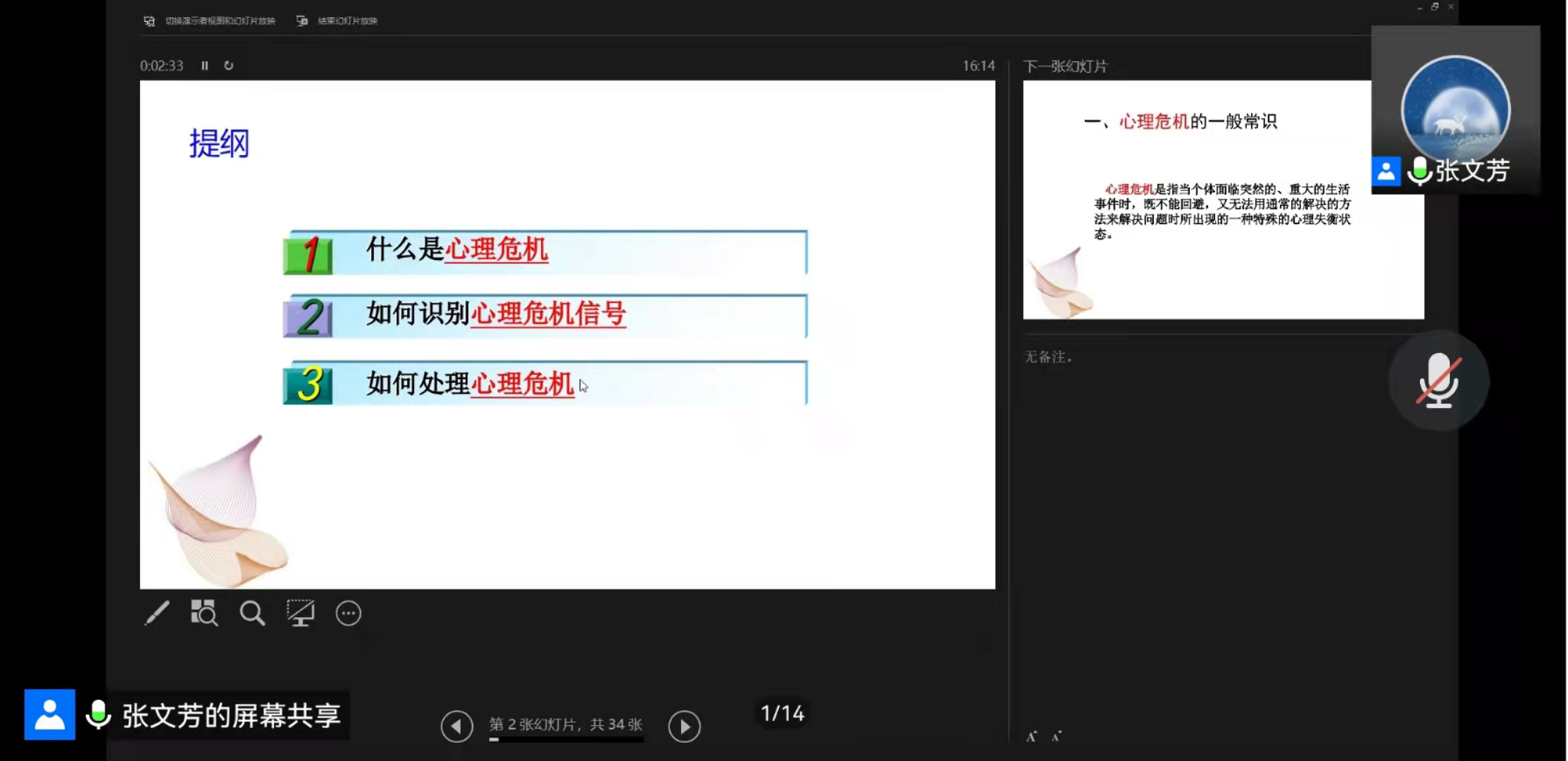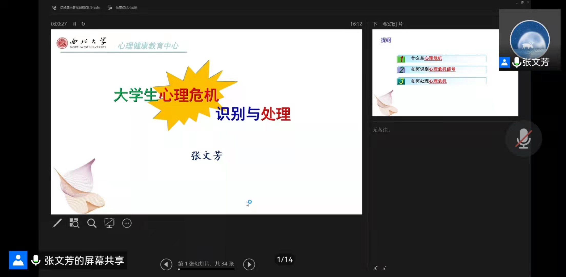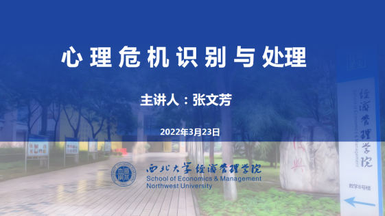 2022年3月23日下午4点,学院邀请西北大学心理健康教育中心张文芳老师线上为心理委员、宿舍舍长、心理协会成员开展了题为“心理危机识别与处理”的心理讲座。讲座由学院心理专干、辅导员戴昶主持,参与讲座人数逾百人。