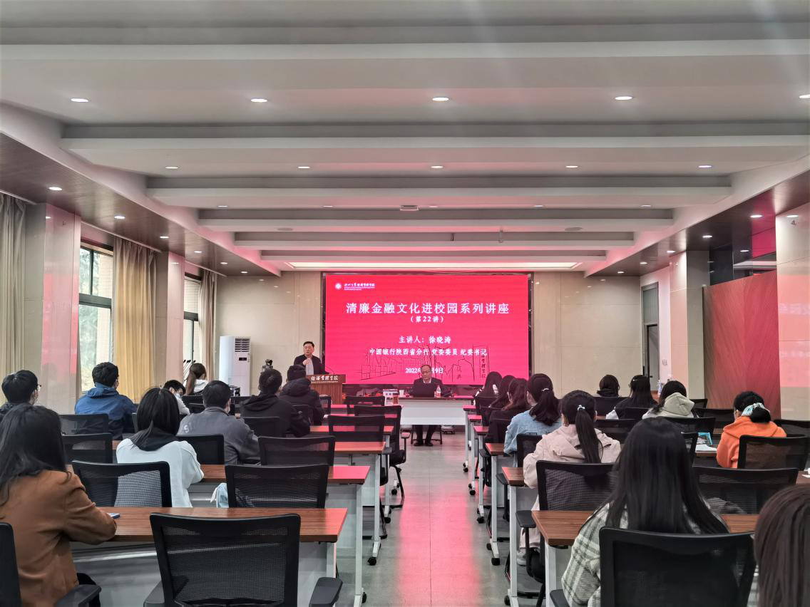 为深入学习贯彻党的二十大精神,深化学院师生对习近平总书记关于“党的自我革命”重要论述的认识,切实加强基层组织建设,增强大学生思想政治教育成效,11月9日,中国银行陕西省分行纪委书记徐晓涛应邀到校,以《坚定理想信念,弘扬廉洁文化,扣好步入社会的“第一粒纽扣”》为题,为学院2022级金融学专业全体学生作了专题讲座,活动由学院党委书记杜勇主持。