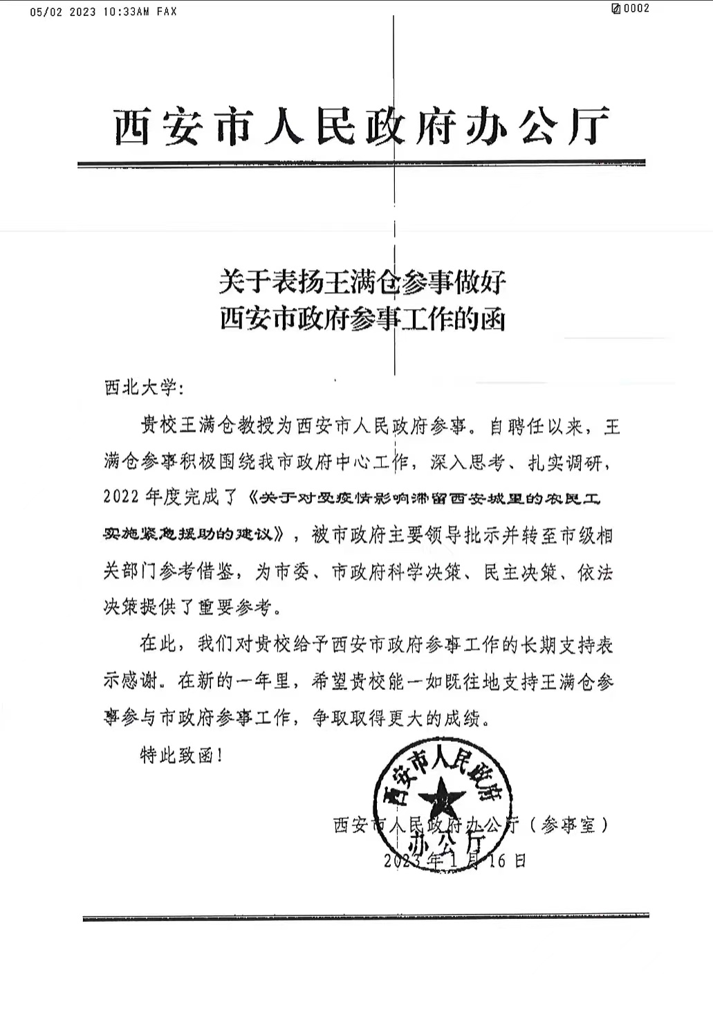 近日,收到西安市人民政府办公厅对我院王满仓教授的发函表扬,表扬函中西安市人民政府办公厅对王满仓教授任西安市人民政府参事以来,积极围绕西安市政府中心工作,深入思考、扎实调研,2022年度完成了《关于对受疫情影响滞留西安城里的农民工实施紧急援助的建议》,被市政府主要领导批示并转至市级相关部门参考借鉴,为市委、市政府科学决策、民主决策、依法决策提供了重要参考,给予了表扬。