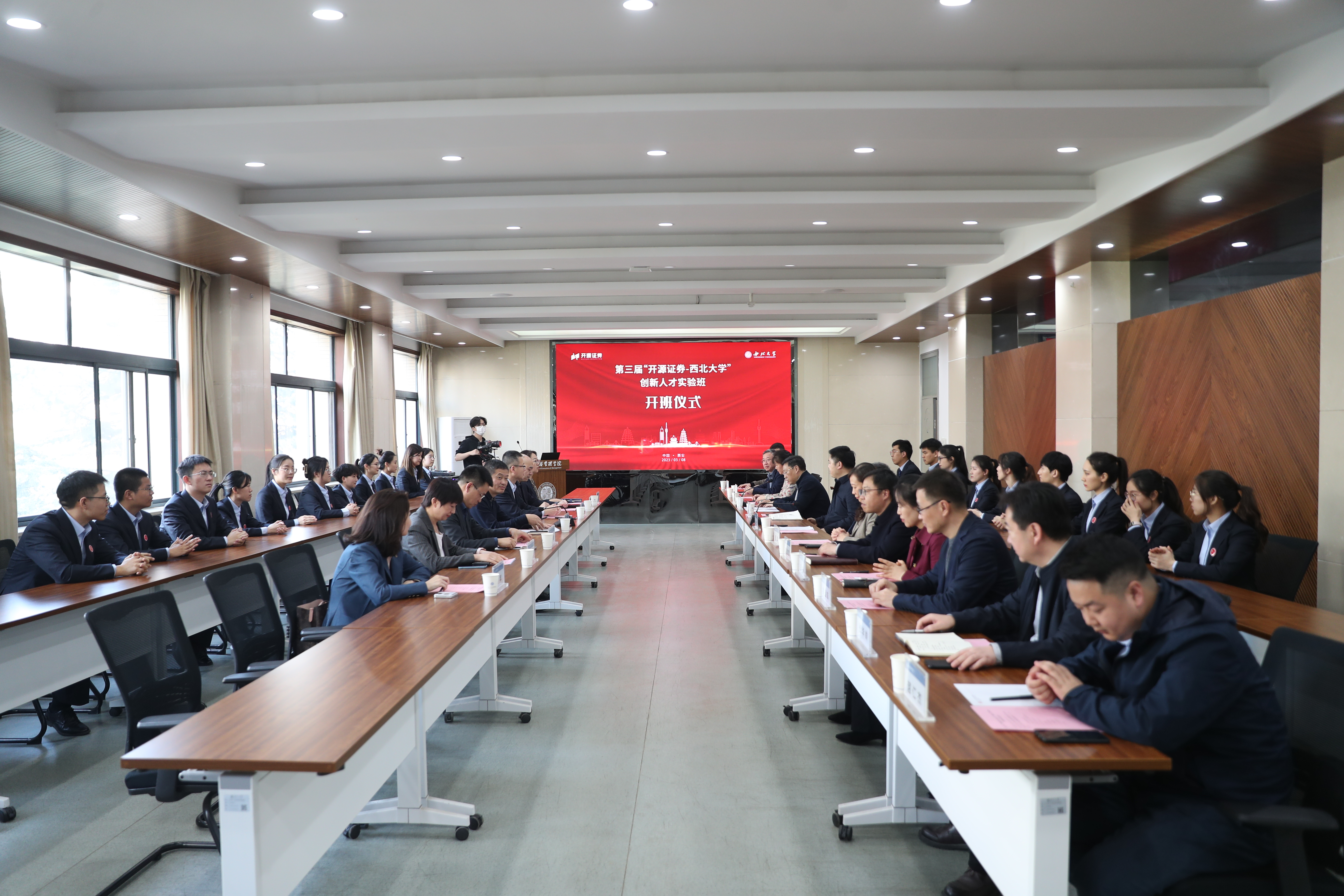 3月8日下午,第三届“开源证券-西北大学”创新人才实验班开班仪式在我院举行。第三届实验班全体学员,开源证券董事长李刚、总经理助理张国松、李青,招商银行西安分行副行长李凯,我校校长郭立宏,教务处处长曹蓉、国内合作与校友工作处处长崔延力、学生工作部副部长赵金哲、研究生院副院长寇楠、学院院长马莉莉及学院班子成员共40余人参加了开班仪式。仪式由学院党委书记杜勇主持。