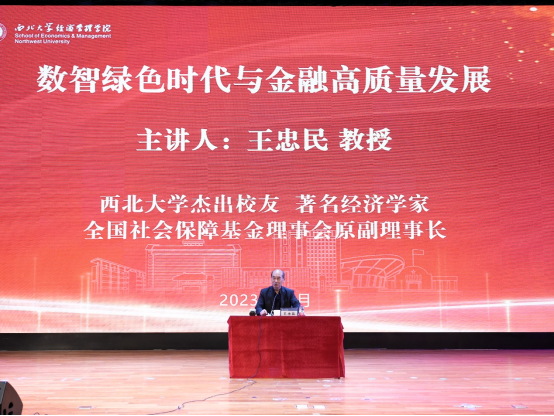 11月17日,杰出校友、著名经济学家、全国社会保障基金理事会原副理事长王忠民教授做客我校“侯外庐学术讲座”第三百二十一讲、经管学院“炼成讲坛”第二讲、第四届“开源证券-西北大学”创新人才实验班开班第一讲、西北大学MBA/EDP“名家面对面”第十三讲,在长安校区学生活动中心为师生作了题为《数智绿色时代与金融高质量发展》的学术讲座。校党委书记王亚杰出席并致辞,讲座由校党委常委、副校长吴振磊主持。