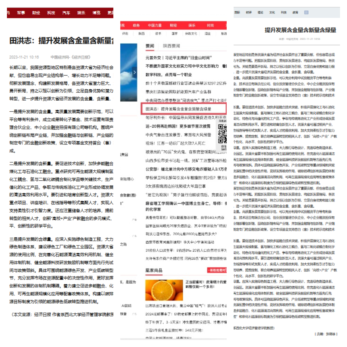 央广网、环球网、凤凰网、光明网等媒体对《提升发展含金量含新量含绿量》分别做了转载和报道。