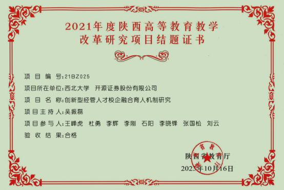 2.完成由西北大学、开源证券股份有限公司共同承担的省级教改项目《创新型经管人才校企融合育人机制研究》结题。