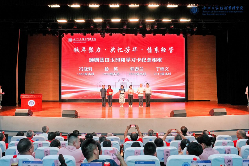 西北大学原校长郭立宏和西北大学副校长吴振磊为返校本、硕、博校友颁赠了蓝田玉印和学习卡纪念相框,表达了学校对每位校友的牵念与祝福。