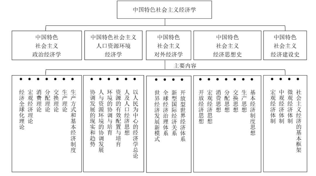 白永秀教授团队围绕中国经济学自主知识体系构建进行了长期研究和探索。在推进中国特色社会主义政治经济学、人口资源环境经济学、“一带一路”经济学的构建中逐渐明晰中国经济学学科体系。中国经济学,也即中国特色社会主义经济学,应包括以人口、资源、产业、环境、制度等核心要素的生产、分配、交换、消费关系为研究对象的中国特色社会主义政治经济学;以人口、资源、环境三者协调运行为研究对象的中国特色社会主义人口资源环境经济学;以对外经济关系为研究对象的中国特色社会主义对外经济学;以中国经济思想产生、演进规律为研究对象的中国经济思想史;以中国经济社会发展演变为研究对象的中国经济建设史等内容。中国经济学学科体系及其主要内容如下图所示。