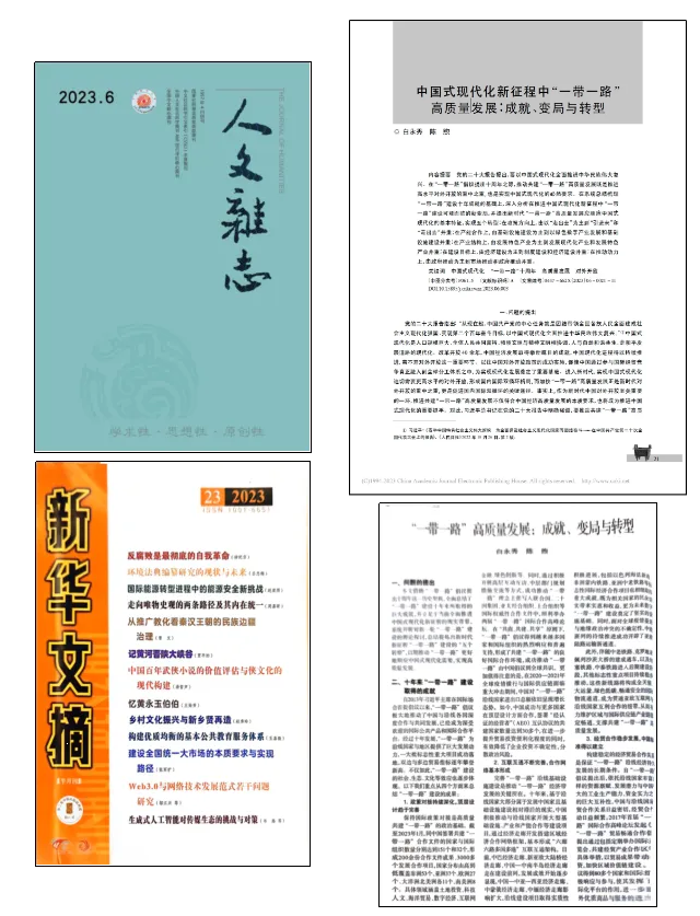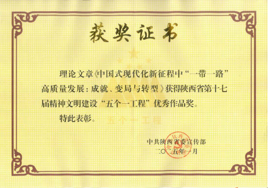 日前,我院白永秀教授和陈煦博士的理论文章《中国式现代化新征程中“一带一路”高质量发展:成就、变局与转型》荣获陕西省第十七届精神文明建设省“五个一工程”优秀作品奖。该项成果刊发于《人文杂志》2023年第6期,并获《新华文摘》2023年第23期全文转载。
