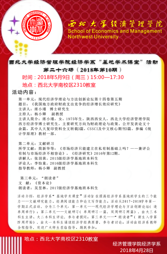 西北大学776net必赢官网经济学系“基地学术课堂”活动第二十六场(2018年第10期)