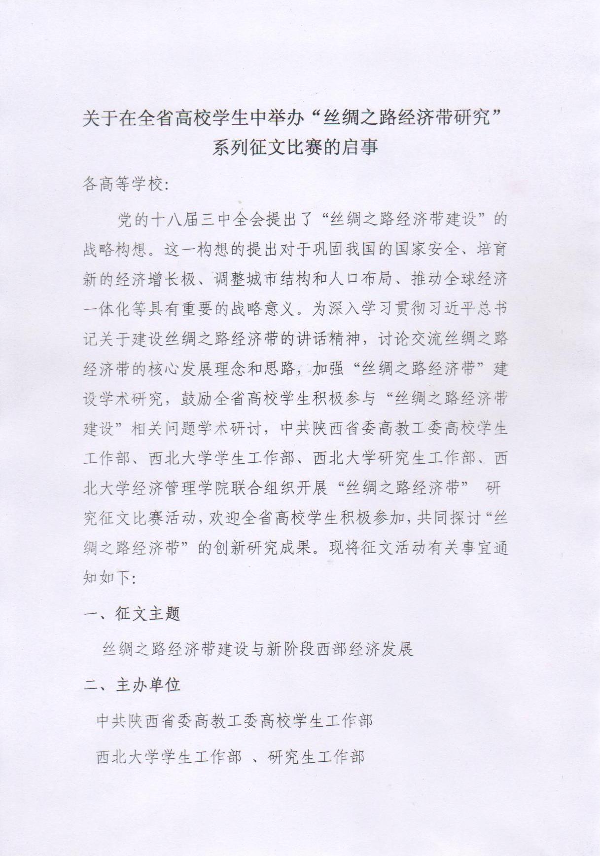 党的十八届三中全会提出了“丝绸之路经济带建设”的战略构想。这一构想的提出对于巩固我国的国家安全、培育新的经济增长极、调整城市结构和人口布局、推动全球经济一体化等具有重要的战略意义。为深入学习贯彻习近平总书记关于建设丝绸之路经济带的讲话精神,讨论交流丝绸之路经济带的核心发展理念和思路,加强“丝绸之路经济带”建设学术研究,鼓励全省高校学生积极参与“丝绸之路经济带建设”相关问题学术研讨,中共陕西省委高教工委高校学生工作部、西北大学学生工作部、西北大学研究生工作部、776net必赢官网联合组织开展“丝绸之路经济带” 研究征文比赛活动,欢迎全省高校学生积极参加,共同探讨“丝绸之路经济带”的创新研究成果。现将征文活动有关事宜通知如下: