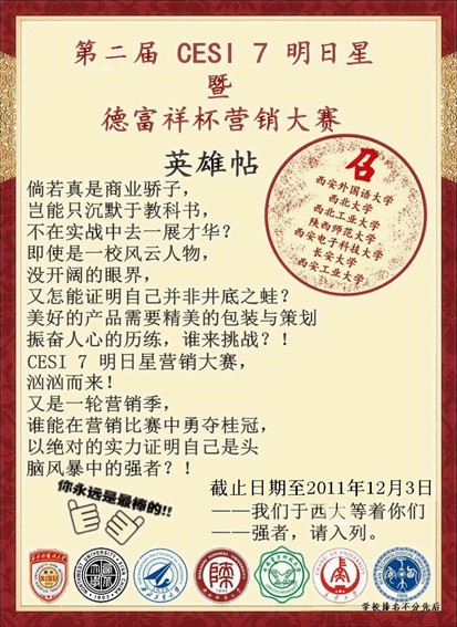 本次大赛是面向西安市七大高校在校大学生的大型营销比赛。主题是为“陕西“德福祥”公司推出的蜂蜜小面包做一个上市方案,要求突出可行性和创新性。通过初赛、复赛和决赛评选出结果,代表西北大学参加七校总决赛。