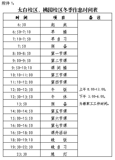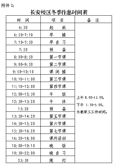 学校从10月1日起实行冬季作息时间,现将《冬季作息时间表》予以公布,请遵照执行。
