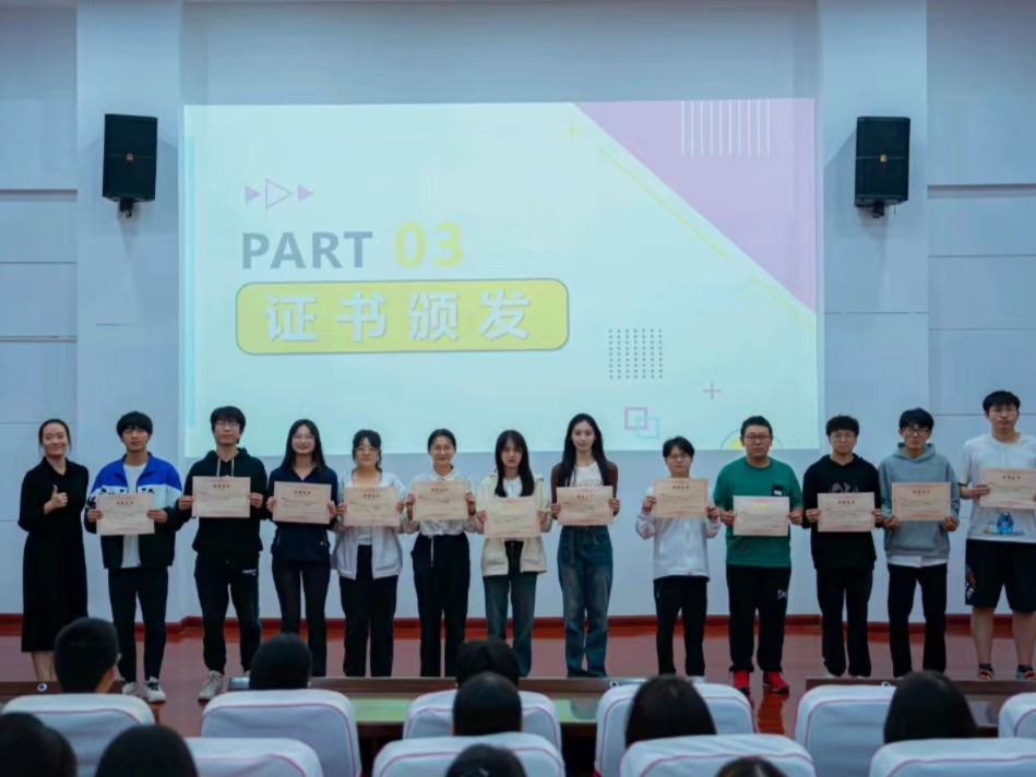 大会第三项,颁发证书。指导老师戴昶宣读了优秀部长、优秀部员的名单,为大家颁发了荣誉证书并合影留念。这既是对心协干部们工作的认可,也是对新部员的激励与鼓舞。