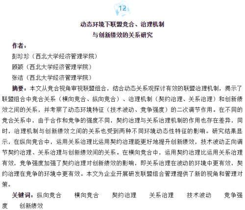 近日,经管院2016级博士研究生彭珍珍、顾颖教授与张洁副教授(通讯作者)在国内顶级期刊《管理世界》2020年第3期上发表了题为《动态环境下联盟竞合、治理机制与创新绩效的关系研究》...